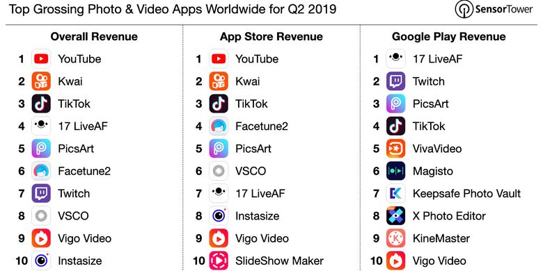Meski demikian, SensorTower tidak mencantumkan berapa pendapatan tiga aplikasi kategori foto dan video teratas di kedua platform penyedia aplikasi resmi tersebut.